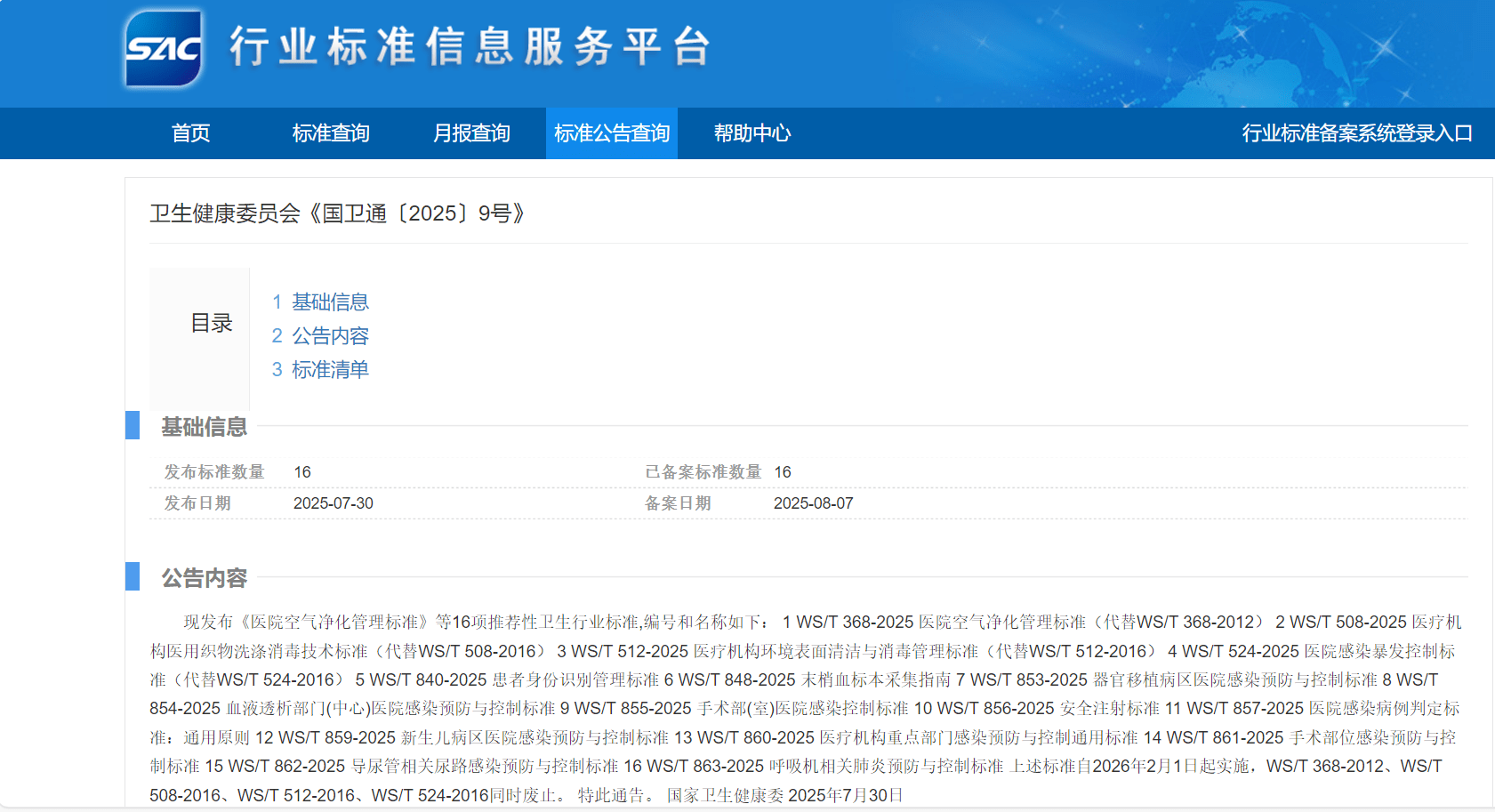 近日,国家卫生健康委员会正式发布《国卫通〔2025〕9号》公告,批准备案16项推荐性卫生行业标准,其中14项聚焦医院感染控制领域,将于2026年2月1日正式实施,同步废止4项旧版标准。作为感控领域的专业从业者,我们深知这些标准的更新不仅是技术规范的调整,更是医院感染防控理念与实践的系统性升级。本文将从专业视角出发,深度解析其中四项核心标准的关键变化与实施要点,为感控工作者提供实用参考。