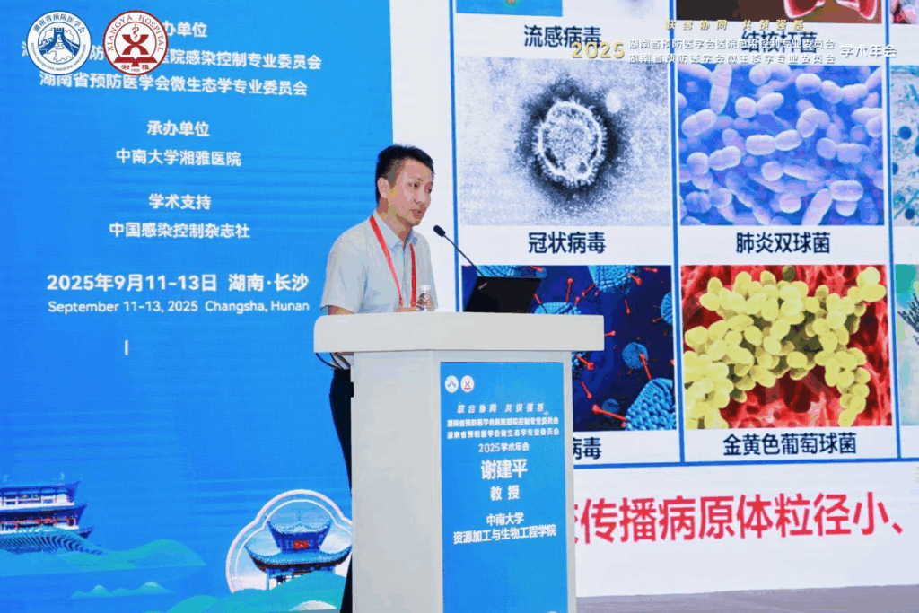 在主旨报告环节,瑞庭科技首席科学家、湖南省预防医学会微生态学专业委员会副主委、中南大学资源加工与生物工程学院谢建平教授作了题为《空气微生物的危害、检测与消杀》的专题报告。他系统分析了空气微生物对医疗环境的潜在风险,梳理了空气采样与消杀技术的发展脉络,并重点介绍了瑞庭科技所采用的“多因子协同催化消杀技术”。