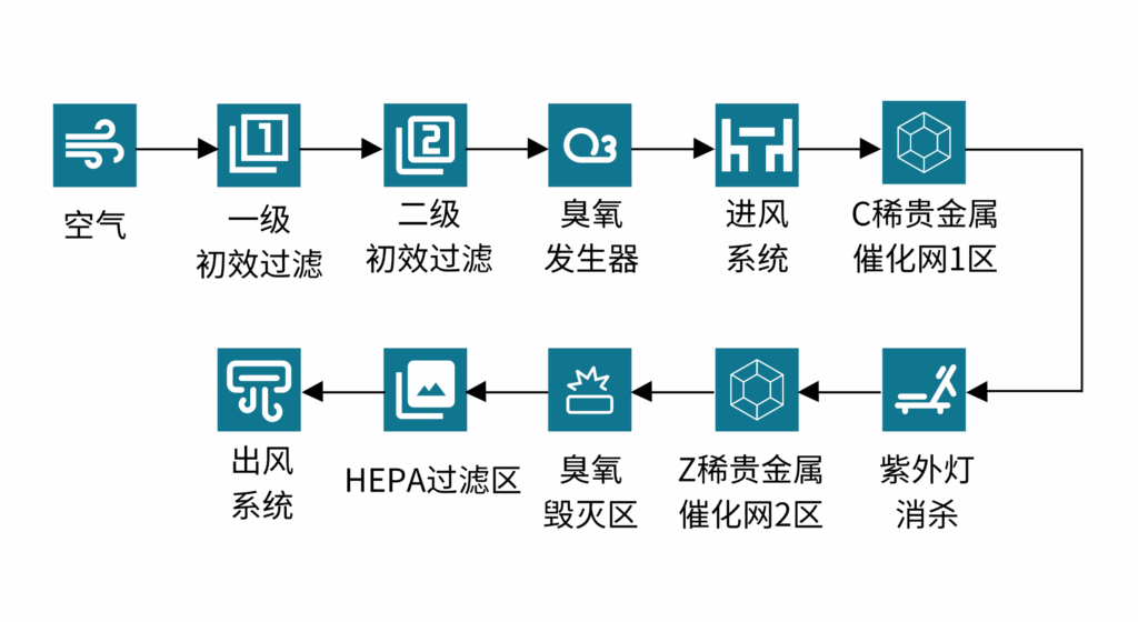 具体而言,设备工作时,空气首先经过初效过滤网去除大颗粒物,随后与臭氧充分混合,经过微生物炭载-多金属量子点催化剂层产生羟基自由基等强氧化性物质,再经3D紫外光催化消毒杀菌,最后通过臭氧分解催化剂将残留臭氧分解为氧气,从而实现“消毒+净化”一体化效果。